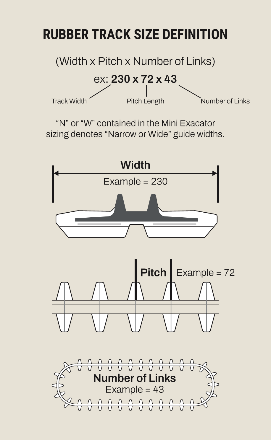 Rubber track sizes are determined using a specific format: